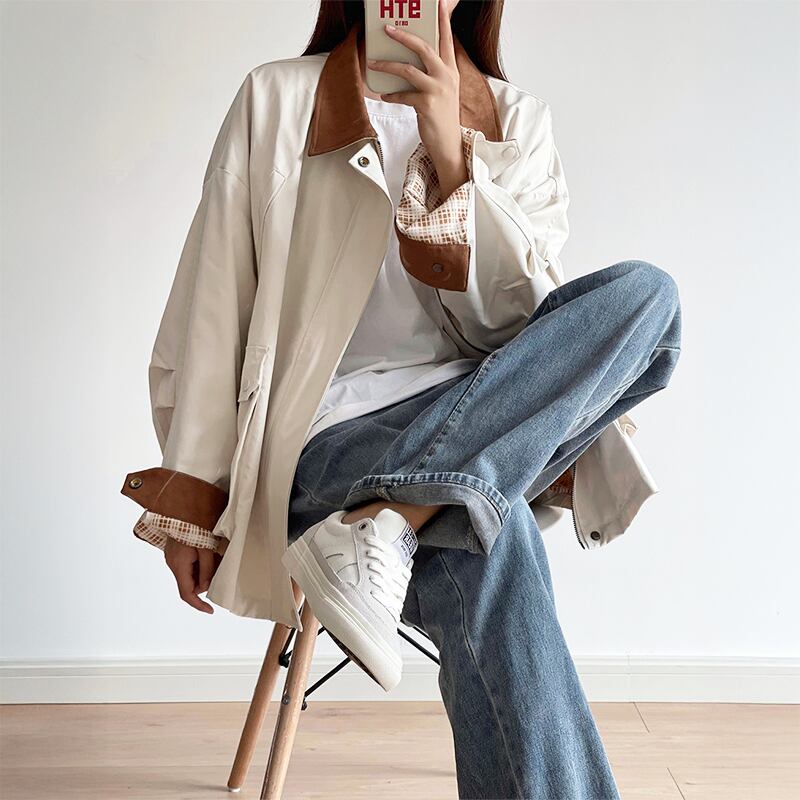 襟元の配色デザインがポイントのミドル丈ジャケット。