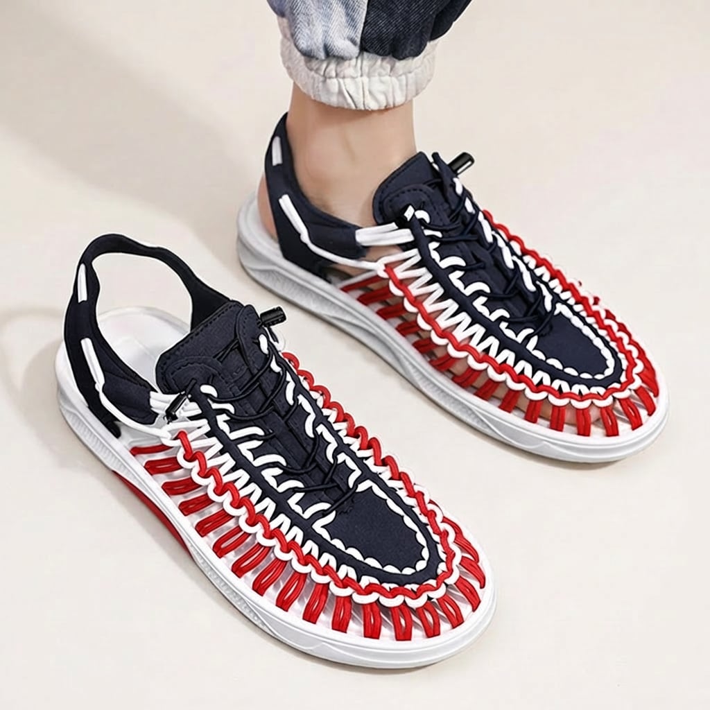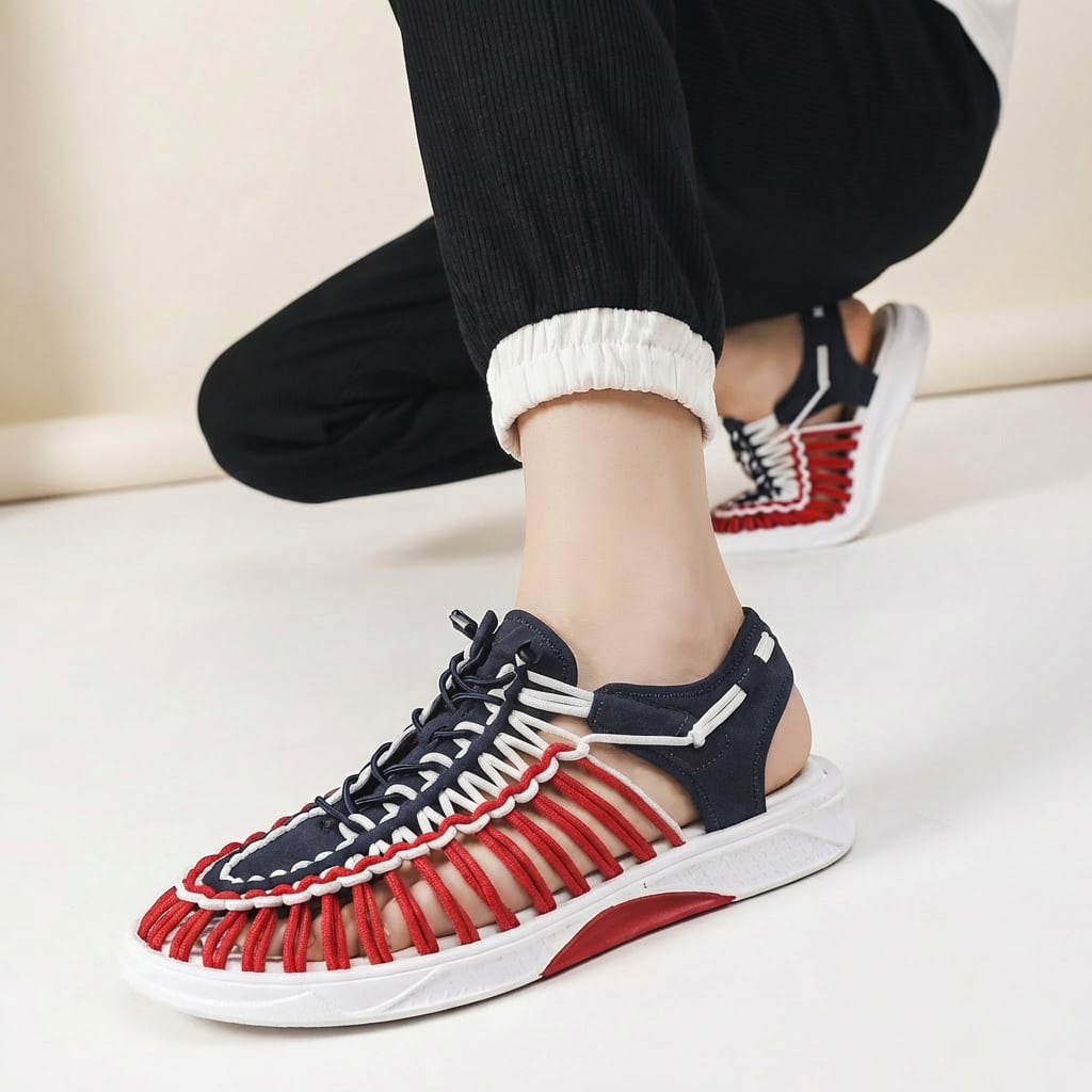 コード編み フラット サンダル レッドブルー M031