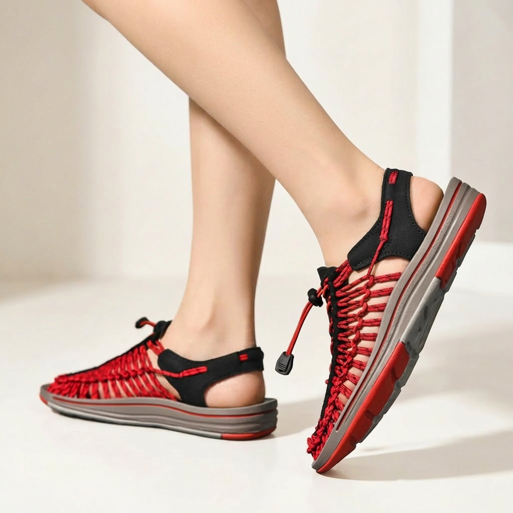 コード編み フラット サンダル ブラックレッド