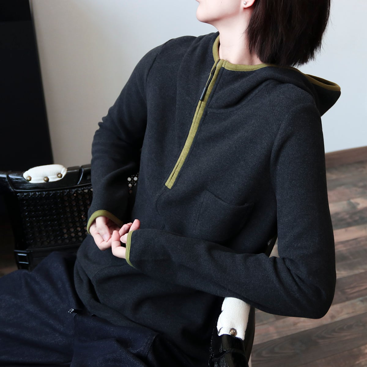 リラックスシーンに最適なフーディースウェット。カジュアルなアイテムながらも、落ち着いたカラーリングで大人っぽく着こなせます。おうちでのリラックスタイムから、ちょっとしたお出かけまで、幅広く活躍するアイテムです。